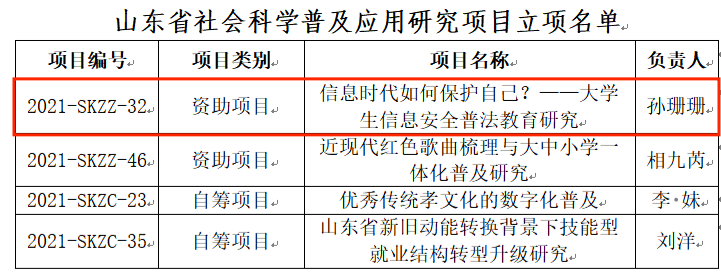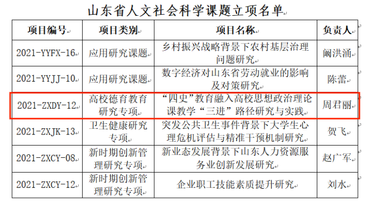 近日,山东省社会科学界联合会公布了2021年度山东省人文社会科学课题、山东省社会科学普及应用研究项目和山东省金融应用重点研究项目立项名单,公司教师申报的2项课题获批立项,其中人文社会科学课题1项、社会科学普及应用研究项目1项,具体名单如下: