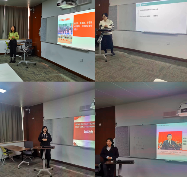 按照抽签顺序,许苓苓、王琳、冯元元和郭晓雪四名老师依次进行了精彩的教学展示。思想道德与法治教研室主任、全省首届学校思政课教学比赛特等奖获得者刘潆,结合自己平时课堂教学和参加教学比赛的经验,从教学分析、教学策略、教学过程、教学反思四个方面和大家进行交流分享。
