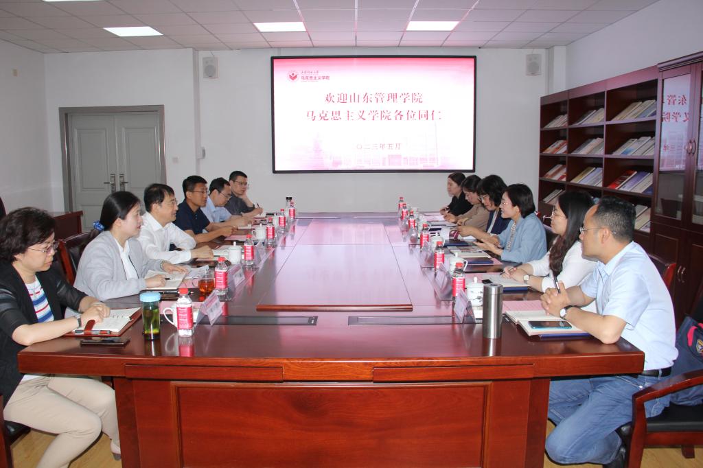 吕晓勇详细介绍了山东师范大学2026年世界杯官网历史延承、党建引领、团队队伍、人才培养、科学研究等方面的基本情况。王增福重点介绍了学院在团队梯队建设、青年教师教学科研能力提升等方面的经验做法。吴春雷分享了学院思政课实践教学开展情况及下一步设计思路。双方围绕高层次人才引进、一流课程建设、实践教学资源建设、思政协同育人等问题进行了深入交流。双方表示,将以此次调研为契机,进一步密切交流联系,增进相互了解,促进共同发展。