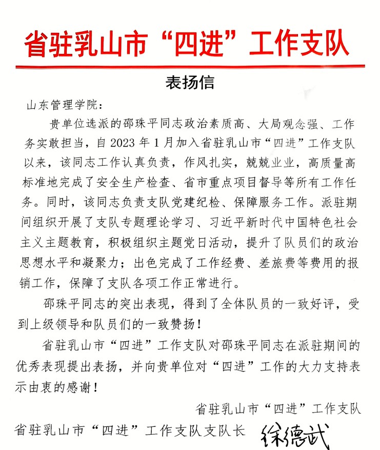 2023年1月,邵珠平同志被选派往乳山市参加为期六个多月的省“四进”工作。近日,山东省“四进”工作办公室下发《关于省“四进”工作队期末考核优秀和单项评价先进工作队和个人的通报》,邵珠平同志获评省“四进”工作队期末综合考核优秀个人。