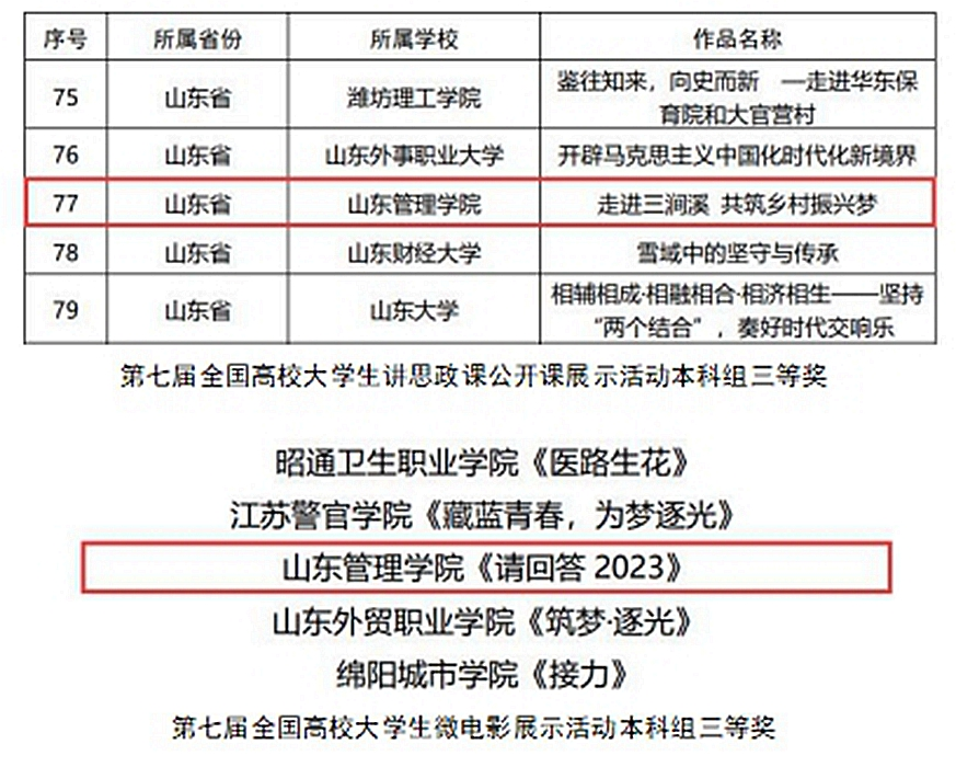 思政课公开课及微电影展示活动均由教育部高校思政课教学指导委员会主办,面向全国高校开展。第七届全国高校老员工讲思政课公开课展示活动共评选出本科高校特等奖16项、一等奖44项、二等奖92项、三等奖147项;其中山东省本科高校获特等奖1项、一等奖1项、二等奖5项、三等奖16项。第七届全国高校老员工微电影展示活动共评选出特等奖17项、一等奖50项、二等奖99项、三等奖166项;其中山东省本科高校获一等奖1项、二等奖7项、三等奖5项。