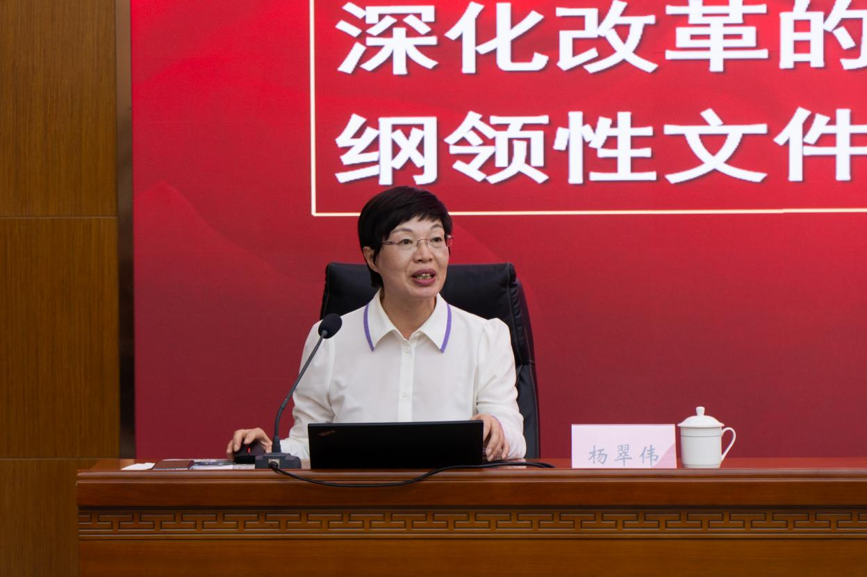 杨翠伟从“世界百年未有之大变局加速演进”“新一轮科技革命和产业革命深入发展”“推进中国式现代化进入到关键时期”引入,介绍了党的二十届三中全会召开的时代背景,对《中共中央关于进一步全面深化改革、推进中国式现代化的决定》内容的3大板块、15个部分、60条举措进行了总体介绍,并通过引用一系列生动鲜活的案例对构建高水平社会主义市场经济体制、健全推动经济高质量发展体制机制、构建支持全面创新体制机制、深化文化体制机制改革等方面进行了细致剖析与精彩阐述;通过大量的案例分析,介绍了在中国式现代化的进程中,山东省勇于担当,积极作为,将国家层面的宏伟战略部署精准转化为一系列生动具体、扎实有效的实践活动的探索之路。
