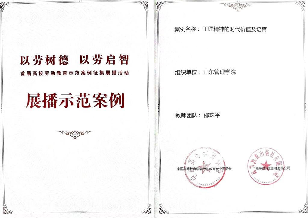 近日,全国首届高校劳动教育示范案例征集展播活动推选结果公布,公司教师邵珠平报送的“工匠精神的时代价值及培育”案例入选展播示范案例。