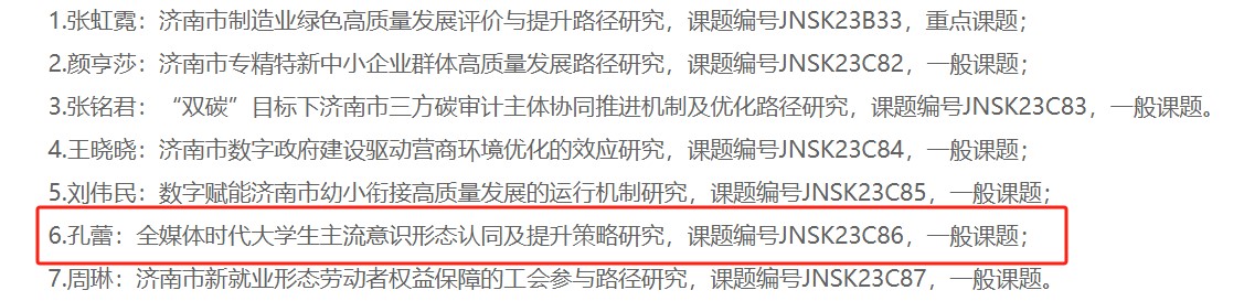 近日,济南市哲学社会科学工作办公室公布了2023年度济南市哲学社会科学规划课题立项名单,公司教师孔蕾申报的“全媒体时代老员工主流意识形态认同及提升策略研究”课题获2023年度济南市哲学社会科学规划课题立项。