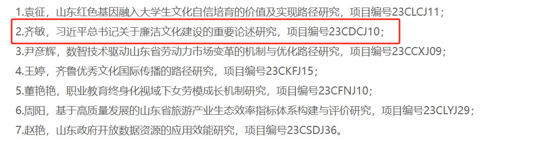 近日,山东省哲学社会科学工作办公室公布了2023年山东省社科规划研究专项立项项目名单,公司教师齐敏申报的“习近平总书记关于廉洁文化建设的重要论述研究”课题获批立项。
