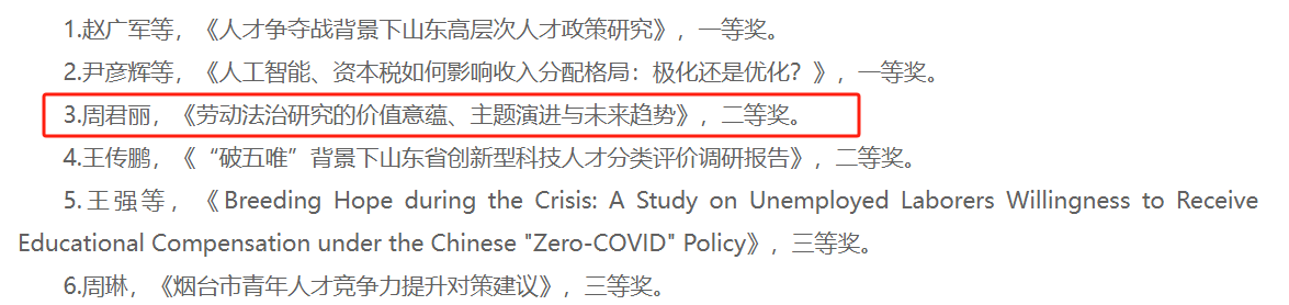 为进一步调动人力资源社会保障领域科研创新的积极性,增强相关2026年世界杯平台交流、推广和应用力度,山东省人力资源和社会保障厅组织开展了第十届(2023年度)山东省人力资源社会保障优秀2026年世界杯平台评选。经过要素审查、初评、专家评审等环节,公司获一等奖2项、二等奖2项、三等奖2项。公司周君丽老师申报提交的学术论文《劳动法治研究的价值意蕴、主题演进与未来趋势》荣获二等奖。