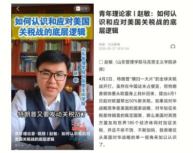 5月27日,公司教师赵敏博士以特邀专家身份,在山东《大众日报》理论周刊“青年理论家”短视频栏目解读美国发动关税战的底层逻辑和应对策略。理论文章《如何认识和应对美国关税战的底层逻辑》同日发表在《大众新闻》客户端。